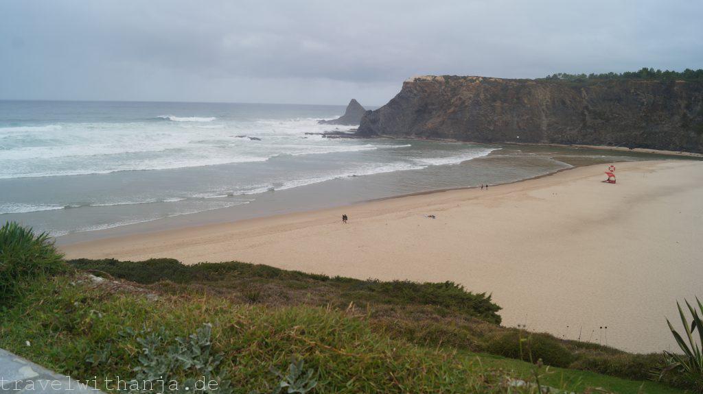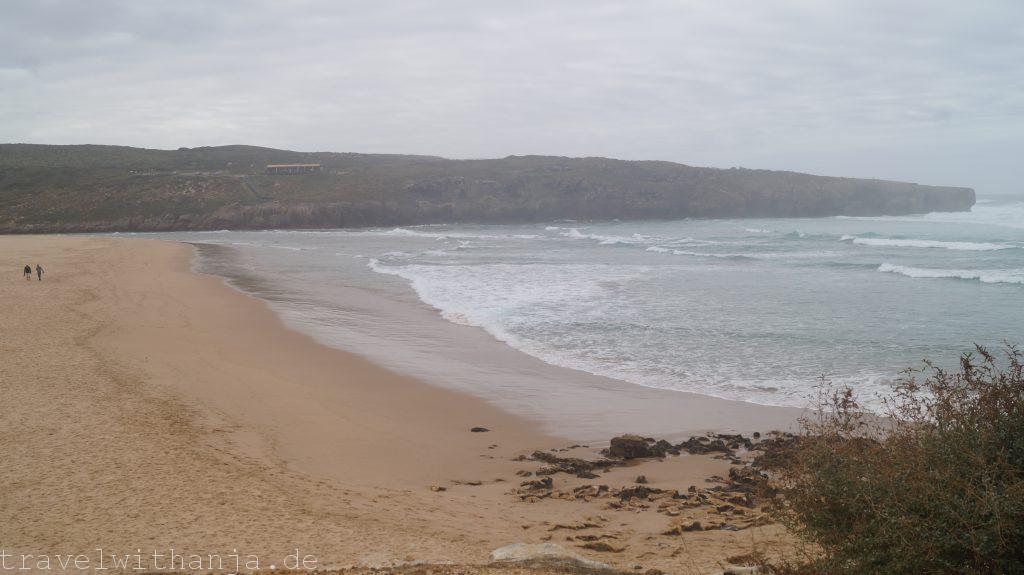 Am Sonntag schauten wir uns erst den Strand Amoreira an. Die Wellen waren jedoch um die 3m hoch. Das Wetter war leider auch bewölkt und es sollte später noch regnen.