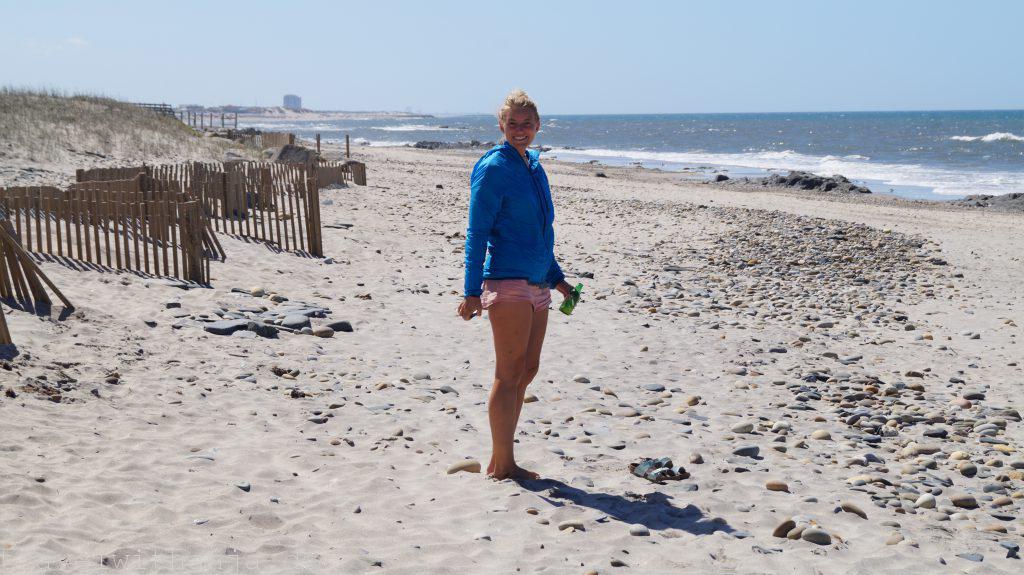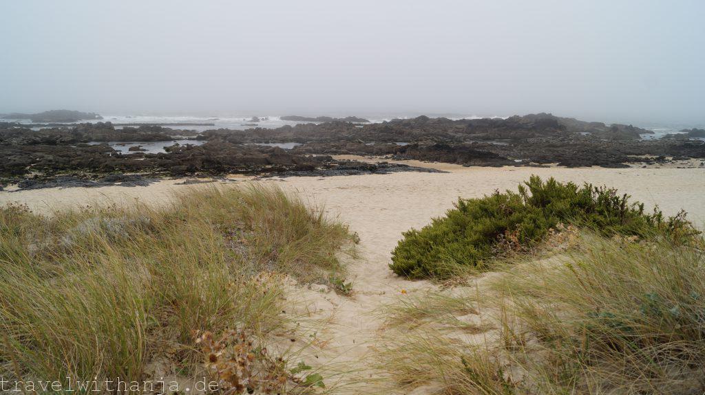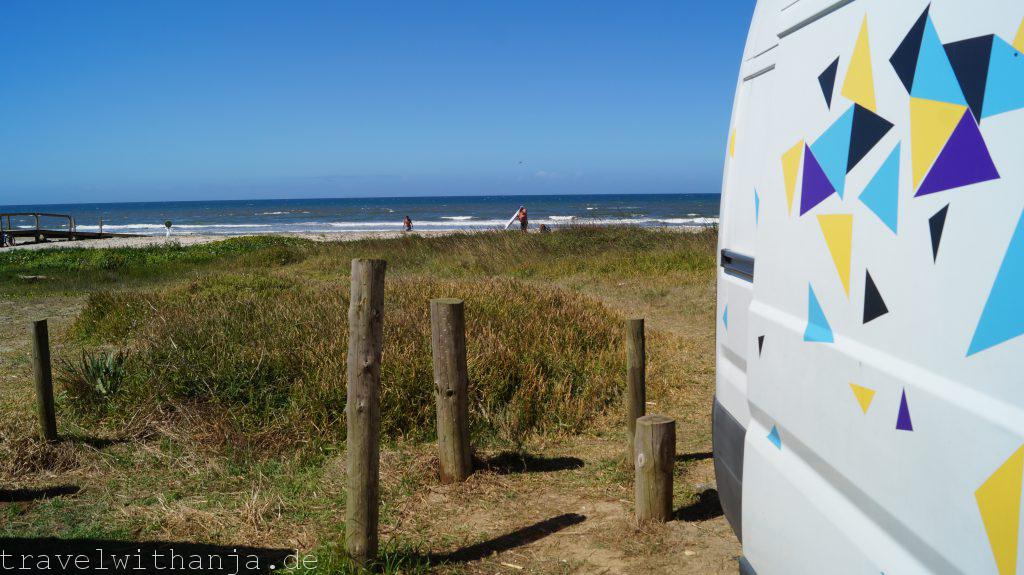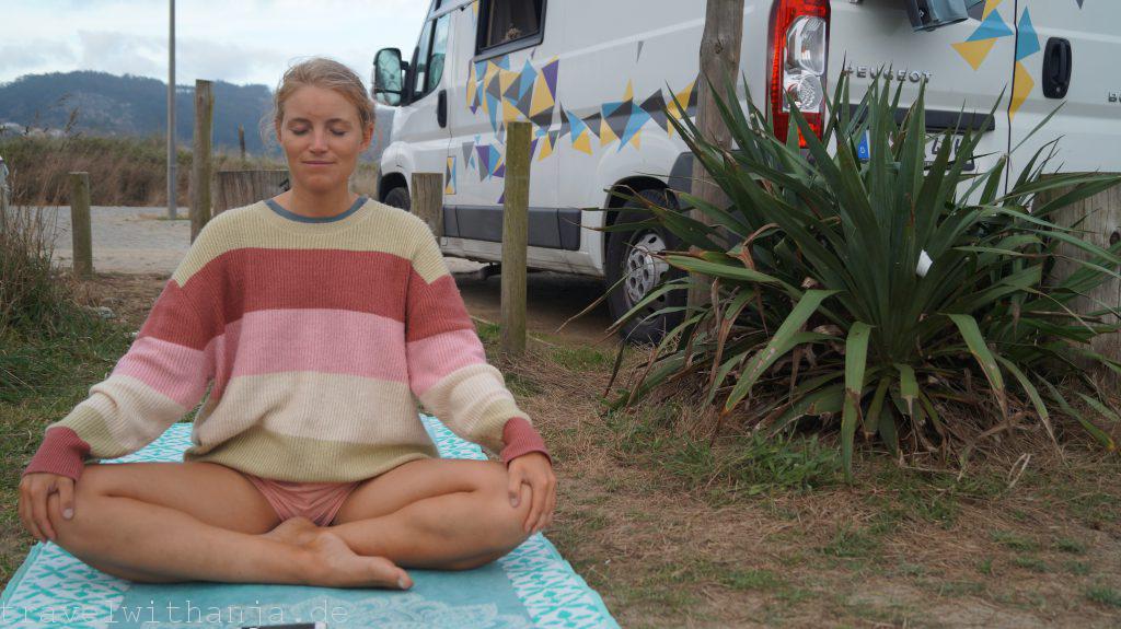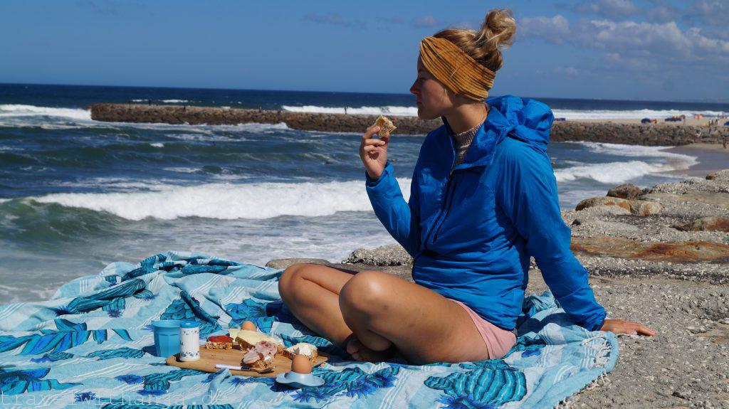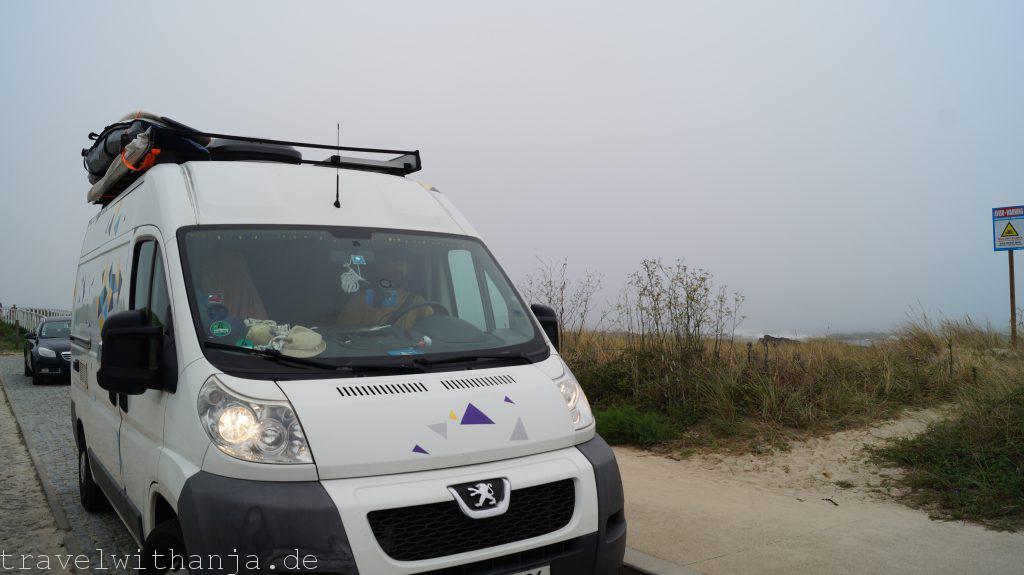 Am nächsten Tag begann mein Tag mit einem kurzen Strandspaziergang, bevor ich anfing zu arbeiten. Mittags machte Sven uns vegane Burger, die wir am Strand aßen. Bevor ich mein letztes Meeting hatte für den Tag, konnte ich während eines Vortrages noch kurz mit dem Tablet am Strand liegen und Inspirationen sammeln. Das war perfekt, denn zum Feierabend zog leider eine dicke Wolkenfront und Nebel auf. Das war ein Zeichen für uns weiter zu fahren. So fuhren wir weiter in den Süden zu dem nächsten Parkplatz bei Mar. Dort standen wir wieder direkt am Meer und konnten nach der Arbeit ins Wasser gehen und Strandtennis spielen. Leider war es zu felsig und die Wellen zu klein, sodass man nicht surfen konnte. Da es aber so entspannt dort war blieben wir bis Freitag Mittag.