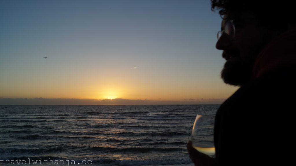 Da es jetzt etwas zu windig zum Kiten war, fuhren wir noch ein Stück südlicher zu dem Surfstrand in Esmoritz. Erschöpft und hungrig von der ungeplanten Toilettensuche und mit Hinblick auf die kleinen Wellen, machten wir uns einen entspannten Abend. Wir kochten uns etwas, fuhren auf der Strandpromenade Surfskate und schauten den Sonnenuntergang über dem Meer an.