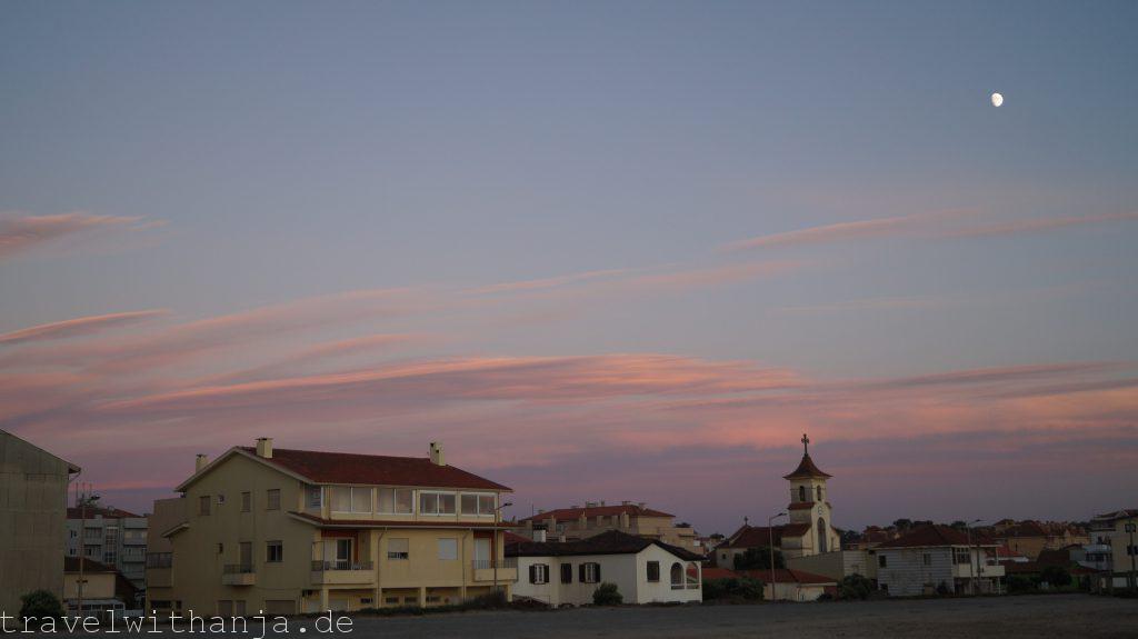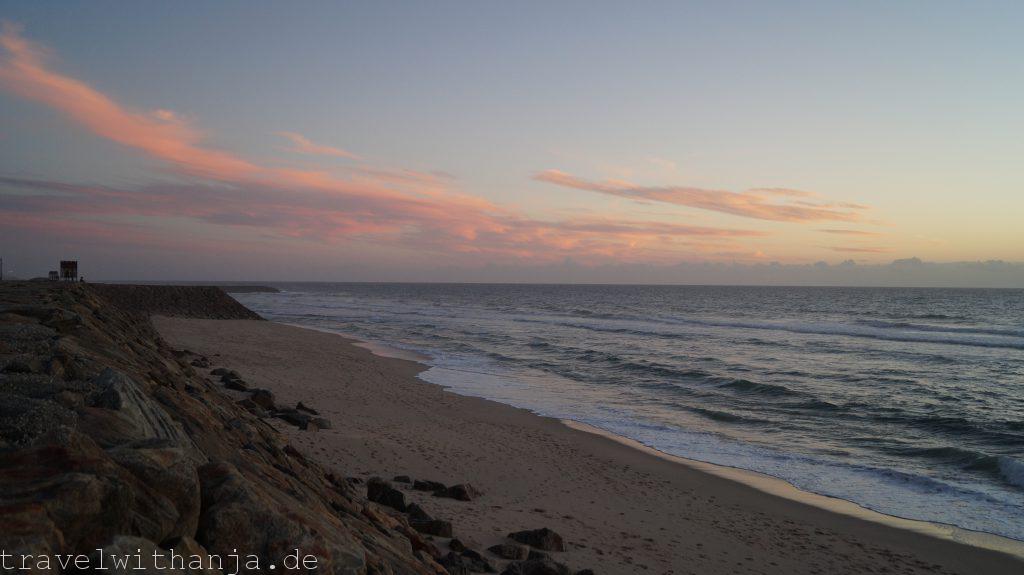 Nach einer weiteren schlaflosen Nacht auf dem Wohnmobilstellplatz am Kitespot bei Viana, in der wir mindestens 20 (!) Mücken töten mussten, verließen wir am Dienstag nach der Arbeit den Ort. Wir schauten uns die Altstadt von Viana an, die sehr schön ist. Danach beschlossen wir bei einem Supermarkt in der Nähe, bei dem es auch Waschmaschinen gab einen Stop zu machen, um einzukaufen und Wäsche zu waschen. Nachdem alles fertig gewaschen und getrocknet war fuhren wir oberhalb von Viana zu einem Tag und Nacht Parkplatz bei Carreco, der direkt am Meer lag. Frisch geduscht schlüpften wir ins saubere Bett und schliefen mit Meeresrauschen ein.