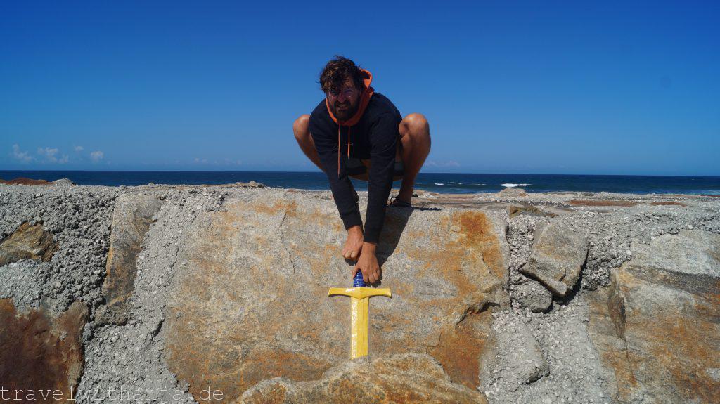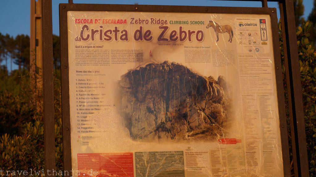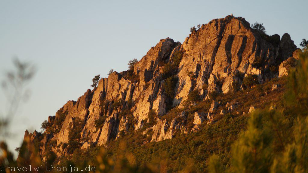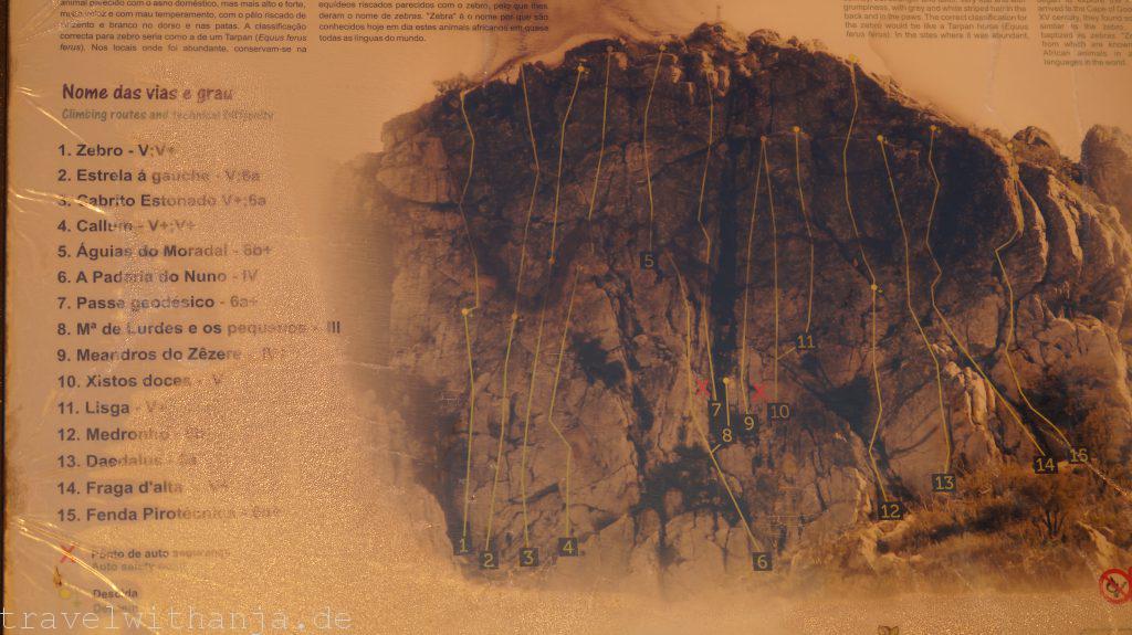 Am Samstag frühstückten wir gemütlich auf dem Deich an der Promenade und schauten den Pro’s beim Surfen zu. Richtige Brecher rollten an den Strand und sogar die Gischt kam bis zu uns auf den Deich hoch. Damit entschieden wir uns in die Berge zu fahren. Wir hatten etwas weiter südlicher und im Landesinnere zwei Klettersteige gefunden und wollten den einen heute klettern. Nach 2,40 Std. Fahrt erreichten wir den Via Ferrata Caminho Sobre o Oceano Ordovicíco endlich. Der Zustieg war sehr verwuchert aber wir erreichten zum Glück den Einstieg. Nach ca. 2 Stunden kamen wir auf dem Gipfel an. Es ist ein leichter Klettersteig, der sehr schöne Passagen beinhaltet und eine atemberaubende Aussicht. Sehr empfehlenswert! Direkt nebenan befindet sich ein Kletterfelsen (40 Klettermeter). Da wir alles zum Klettern dabei haben und die Routen auf einer Übersichtskarte vor Ort ausgeschildert sind, entschieden wir uns, hier zu bleiben und am Fuße des Felses zu übernachten (Nähe Sarnadas Sao Simao). Um Mitternacht legten wir uns draußen auf eine Decke und schauten uns die Sterne an.