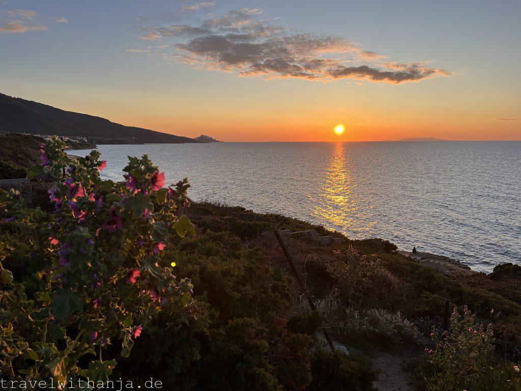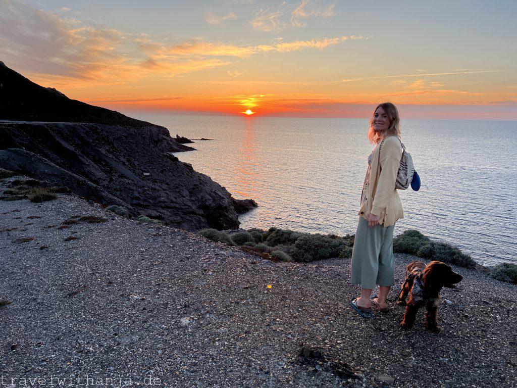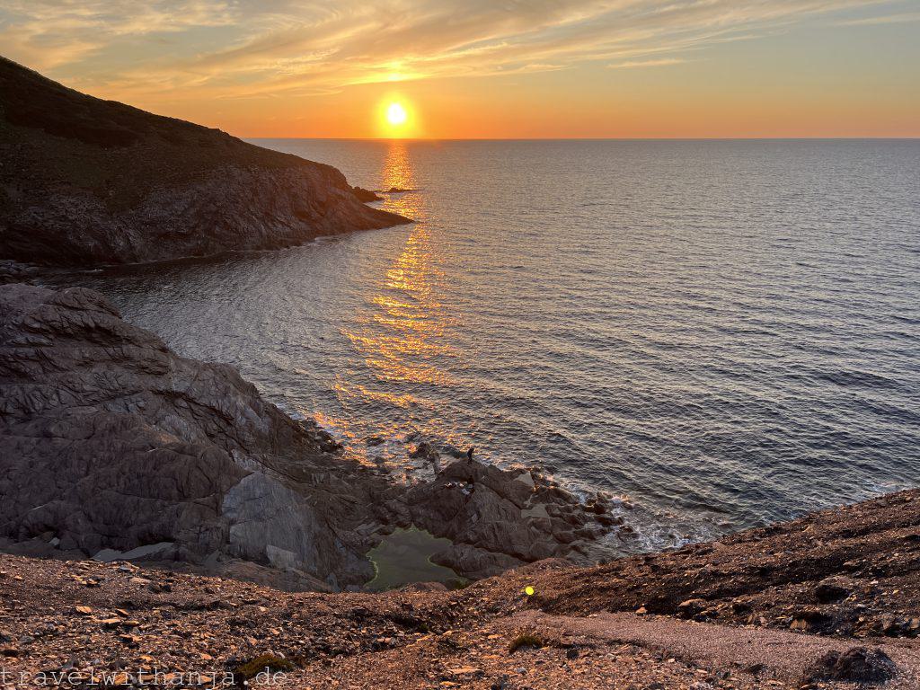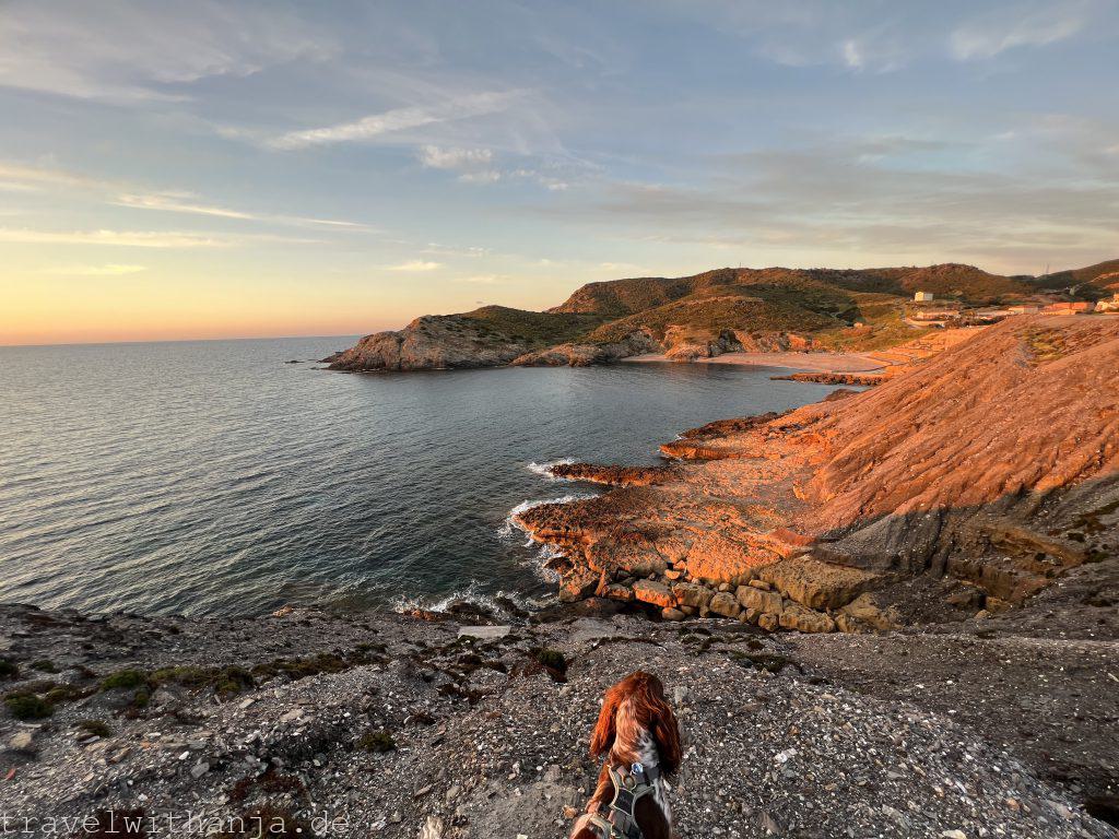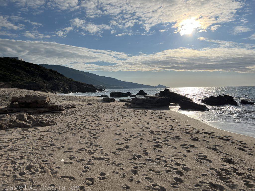 Auch wenn es noch nicht sehr bekannt ist, Sardinien bietet zahlreiche Surfspots mit guten Wellen gerade im Frühjahr. Dies war der Grund, warum wir uns diese Insel als unser nächstes Ziel ausgesucht hatten. Tatsächlich hat die Insel landschaftlich und kulturell aber auch noch ganz viel mehr zu bieten. Nach einer 5 stündigen Fährfahrt von Korsika nach Sardinien, Santa Teresa di Gallura, waren wir angekommen und konnten auf Endeckungstour gehen. Wir suchten uns einen Wohnmobilstellplatz an der Nordküste beim Spiaggia di Maragnani und dem Ort Valledoria. Es war ein langer, weißer Sandstrand an dem auch ein Kitespot war. Allerdings hatten wir die ersten beiden Tage nicht genügend Wind zum kiten und wir mussten zudem arbeiten. Dadurch vergingen die ersten beiden Tage auf Sardinien schnell. Abends unternahmen wir mit Grobi lange Strandspaziergänge und genossen den herrlichen Sonnenuntergang.