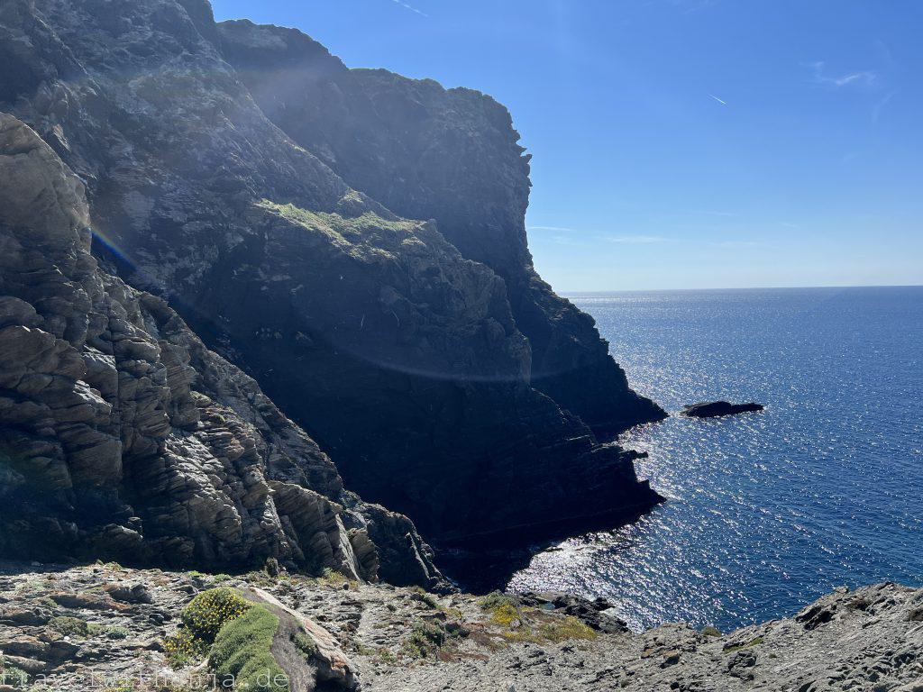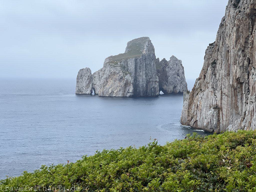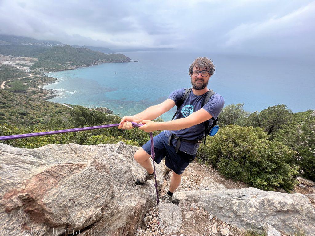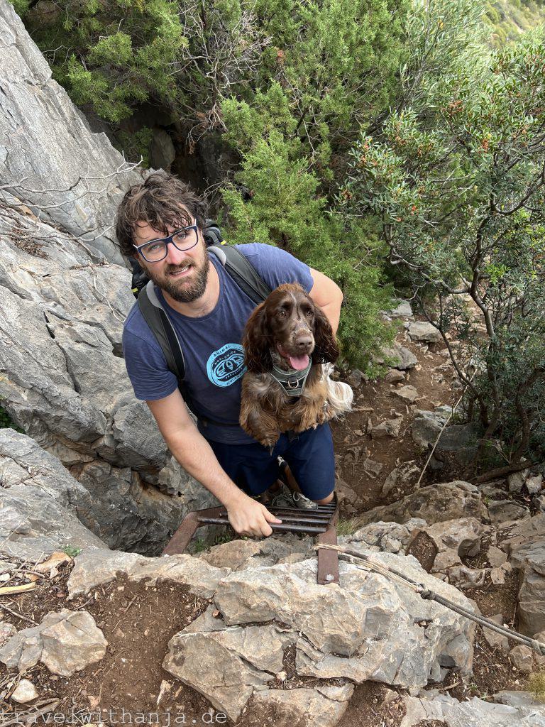 Anschließend fuhren wir zu Porto Flavia, wo man ein altes Bergwerk direkt an der Küste besichtigen kann. Hunde sind hier jedoch nicht erlaubt. Wir machten stattdessen eine Wanderung, von der wir eine herrliche Aussicht auf die kleine Insel, Pan di Zucchero, hatten, die vor Porto Flavia liegt. Die Wanderung führte zudem durch ein Klettergebiet, was sehr interessant aussah. Die Routen waren am Fels mit Schwierigkeitsgraden beschriftet. Sicher ein Grund bei einer zukünftigen Reise noch einmal hierhin zu kommen. Weiter oben am Berg erwies sich die Wanderung als anspruchsvoller. Kleine Kletterpassagen und Kraxeleien über eine Leiter waren Teil des Weges.