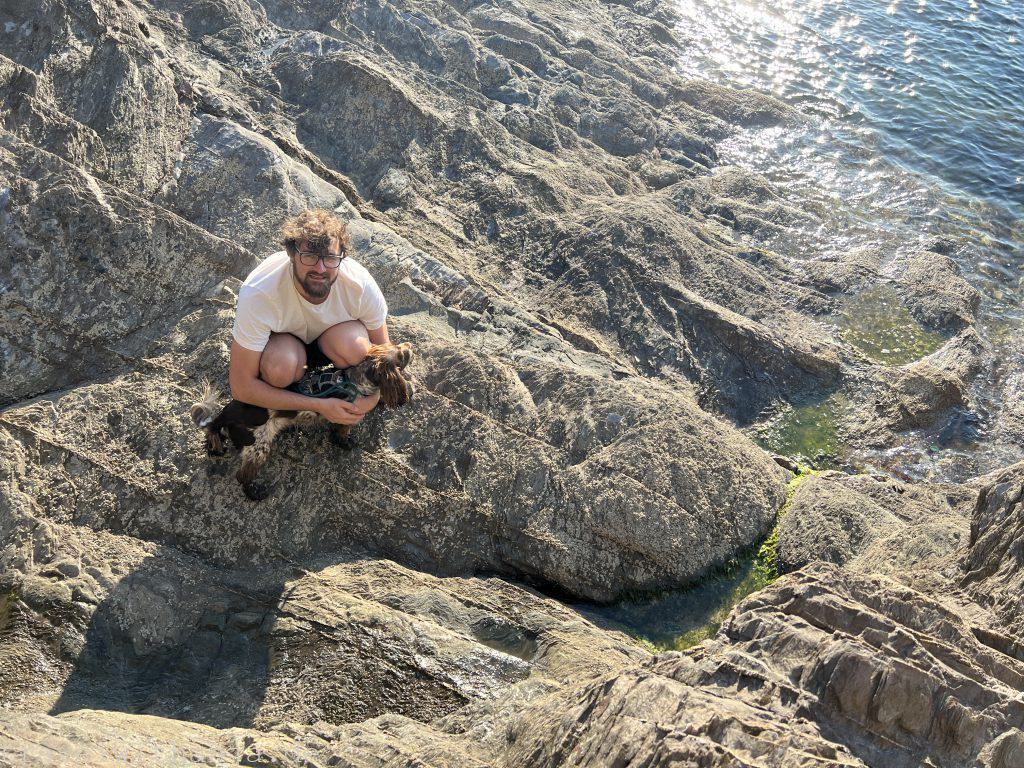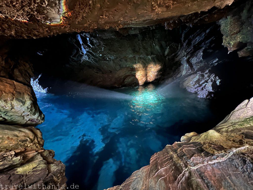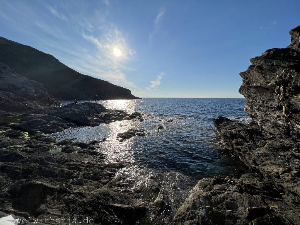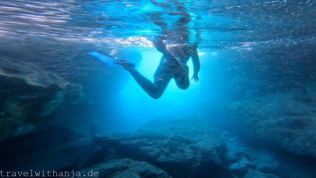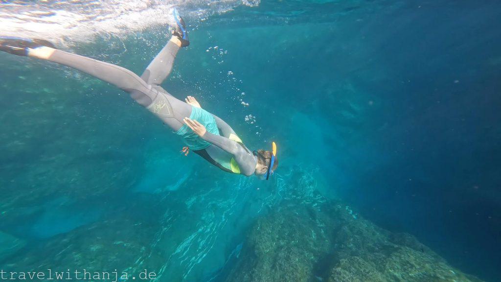 Am nächsten Tag arbeitete ich relativ lange und Sven erkundete schon mal die umliegenden Felsen mit Grobi. Dabei fand er eine kleine Höhle unten beim Meer, die mit Wasser gefüllt war. Nachdem ich fertig war mit Arbeiten nahmen wir unsere Schnorchelsachen und den Neoprenanzug und gingen auf Höhlenerkundungsstour. Das Wasser war sehr kalt in der Höhle aber glasklar. Wir konnten die Felsformationen auf dem Grund bewundern und manchmal kam auch ein Fisch vorbeigeschwommen.