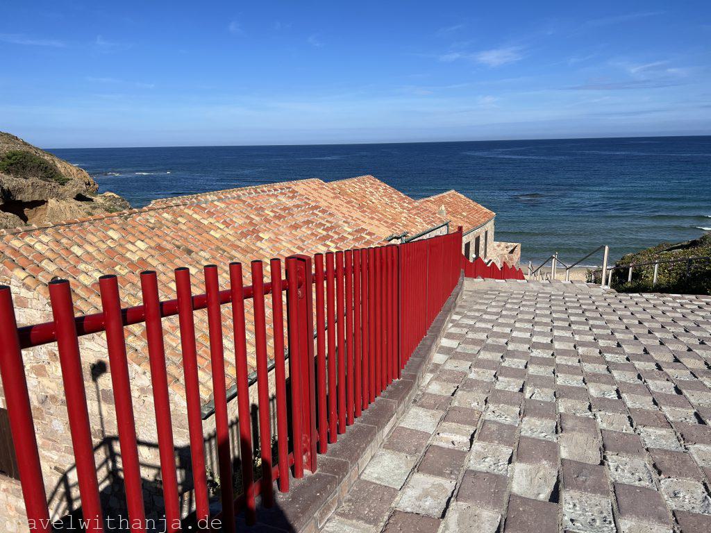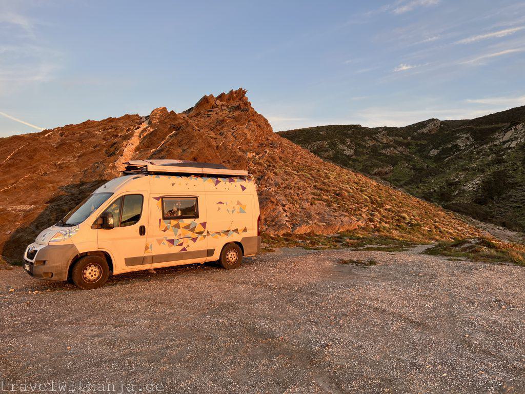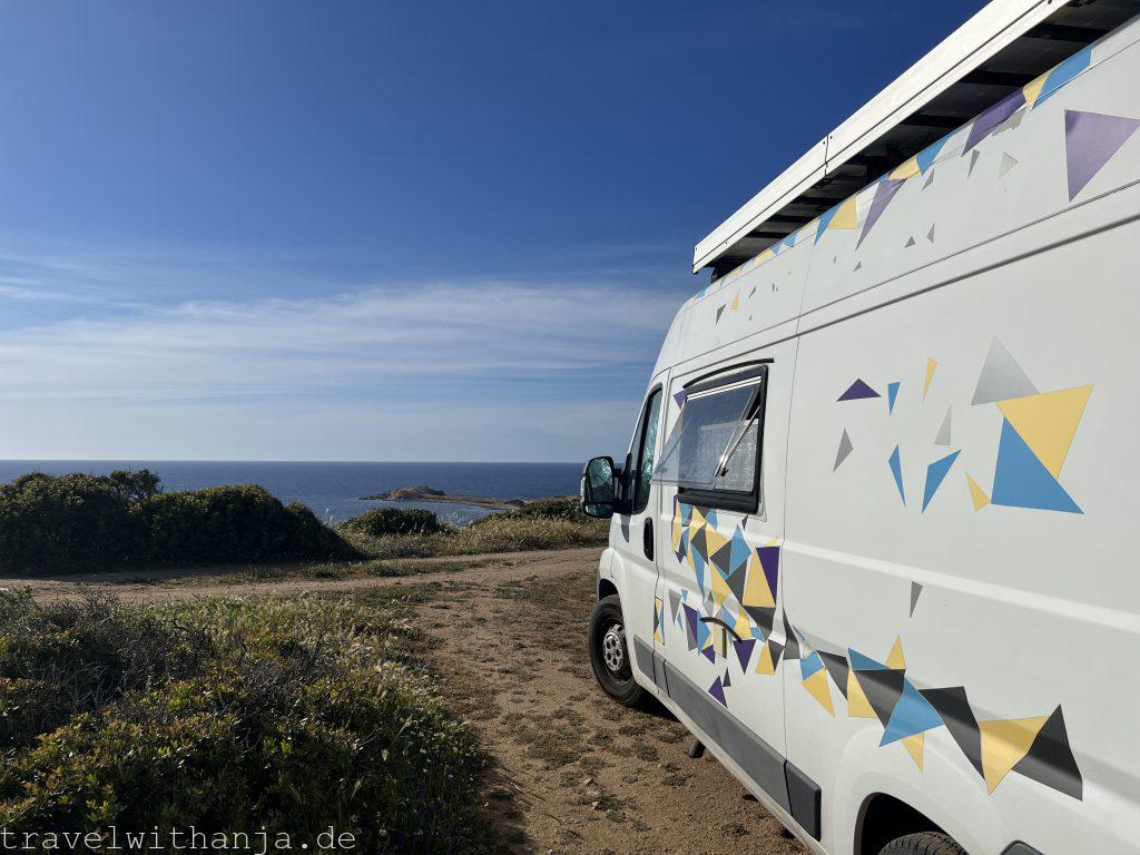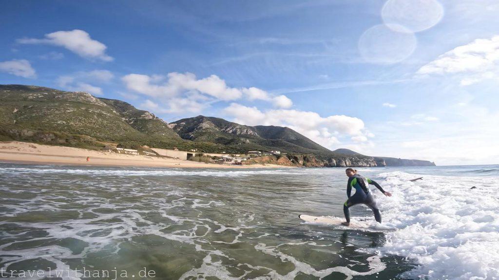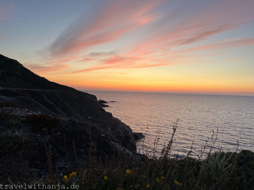 Ich musste am nächsten Tag arbeiten, sodass wir dort stehen blieben. Der Internetempfang war zum Glück sehr gut. Nach einem erfolgreichen Arbeitstag mit herrlichem Ausblick fuhren wir zum Surfstrand. Die Wellen waren allerdings zu klein, sodass wir nur einen ausgiebigen Strandspaziergang machten und den herrlichen Sonnenuntergang bewunderten. Wir blieben direkt am Spot stehen für die Nacht, da die Wellenvorhersage für den nächsten Tag vielversprechend war. Wir hatten Glück! Ich konnte meine erste Surfsession in meiner Mittagspause machen und auch nach der Arbeit waren die Wellen noch perfekt. Nach einer perfekten Session fuhren wir zu unserem nächsten Stellplatz, welcher oberhalb von dem langen Sandstrand, Spiaggia di Porto Paglia, lag.