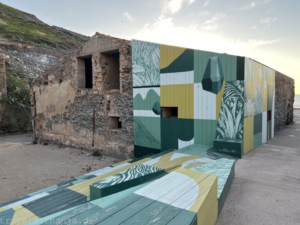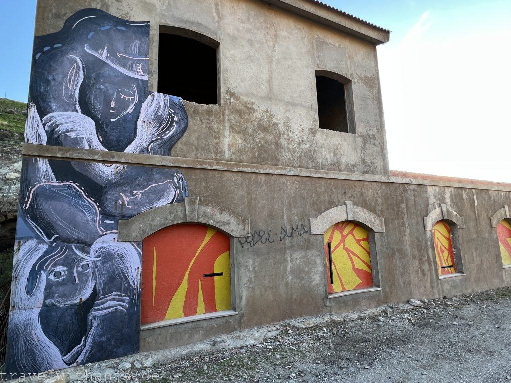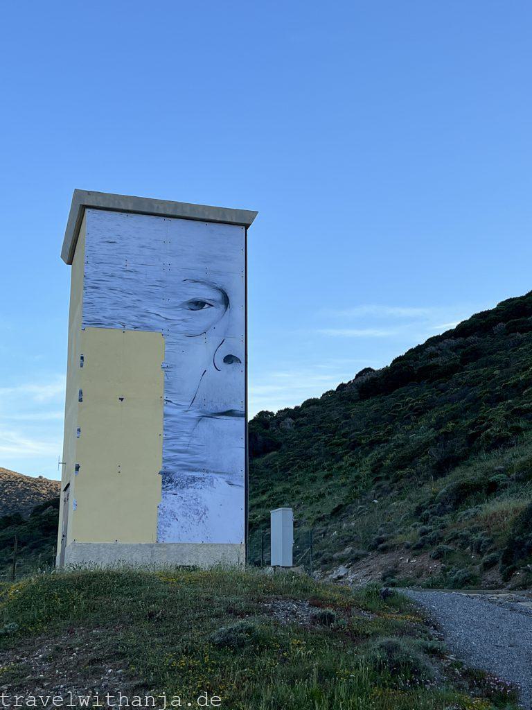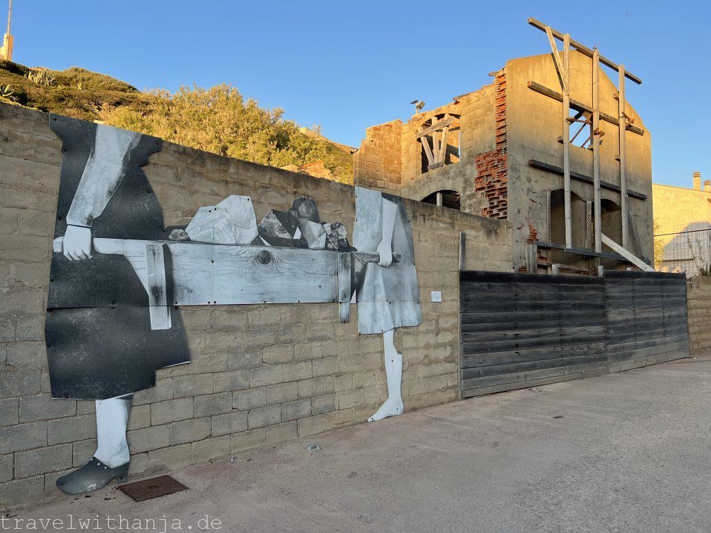 Bevor wir nach Buggerru fuhren mussten wir noch einen Ort finden, um unsere Toilette zu entleeren und Frischwasser aufzufüllen. In dem kleinen Ort im Hinterland von Buggerru, Fluminimaggiore, fanden wir bei einem Suppermarkt eine Entleerungsmöglichkeit und an der Tankstelle Wasser zum Auffüllen. Außerdem gab es einen öffentlichen Brunnen an dem sogar die Einheimischen Wasser holten. Der Ort war sehr verschlafen aber hatte schöne Wandgemälde und im Sommer ist es sicher überlaufen. In einer Pizzeria in der Nähe des Brunnens aßen wir unsere erste sardinische Pizza. Danach ging es dann endlich nach Buggerru. Wir parkten einsam, inmitten der Natur auf einem Park4night Stellplatz mit 360° Ausblick nördlich des Strandes von Buggerru.