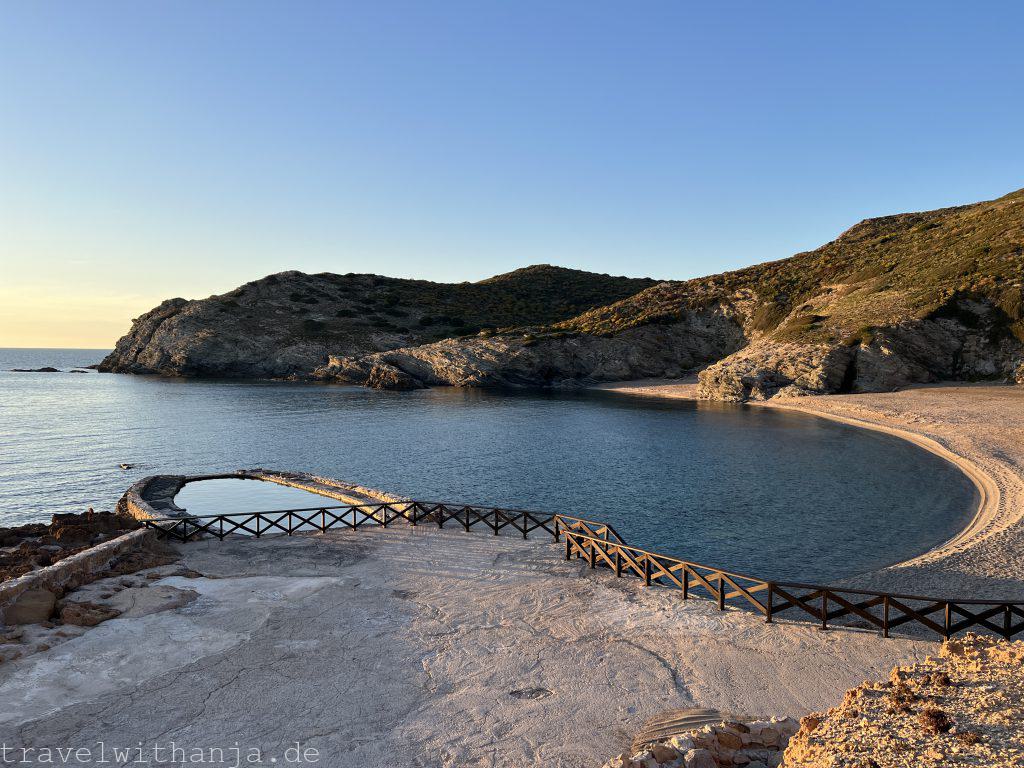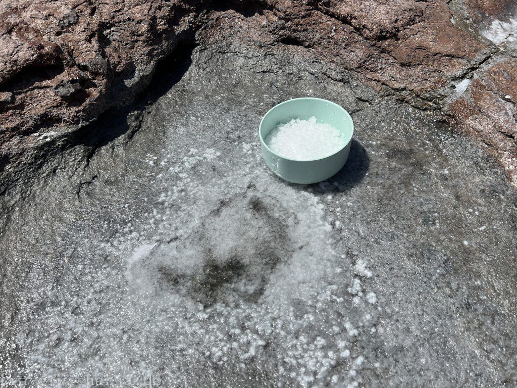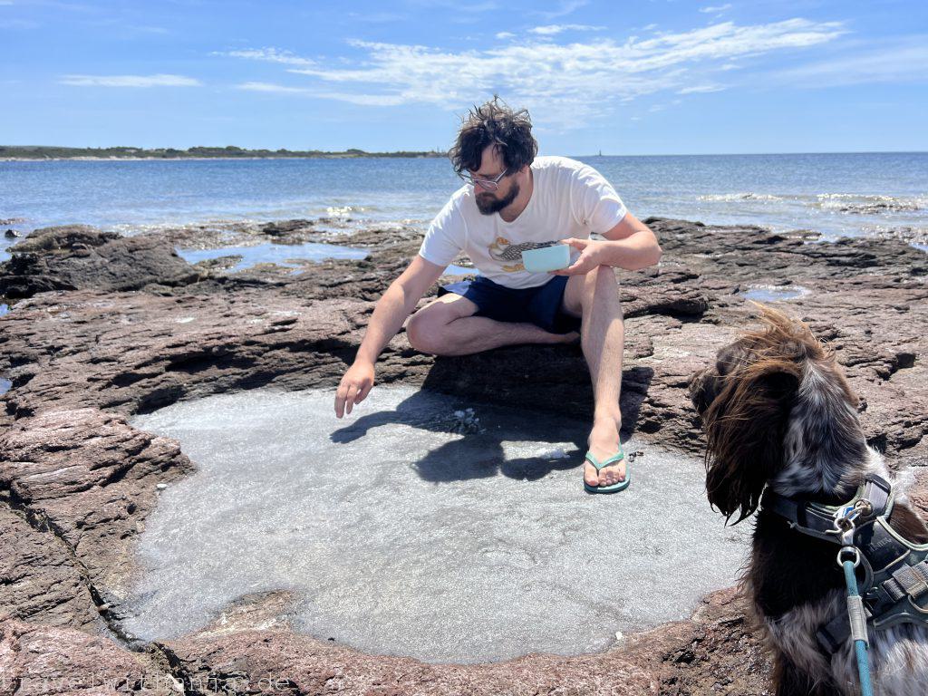 Anschließend ging es weiter zur Halbinsel Sant Antioco. Wir fuhren zu einem Strand auf der Halbinsel, wo wir spazieren gingen. Dabei entdeckten wir Salzbecken auf den Steinen am Meer. Daraufhin schöpften wir unser eigenes Meersalz. Für die Nacht entschieden wir uns für einen Stellplatz am Meer unweit der Halbinsel an einem Kitespot.