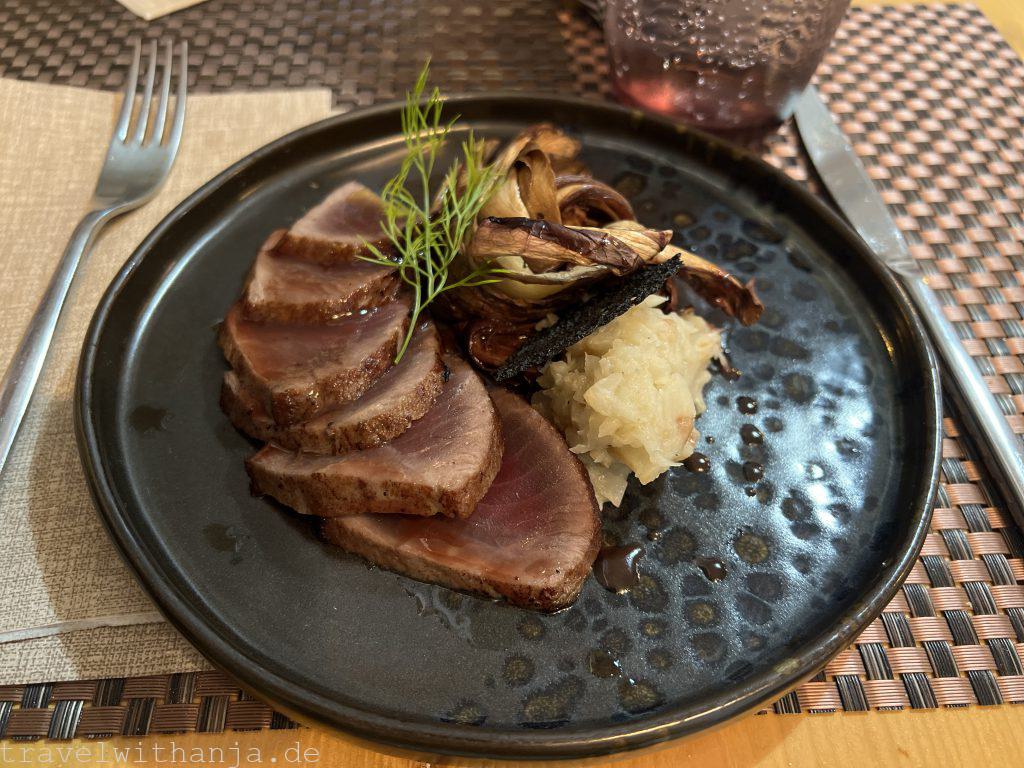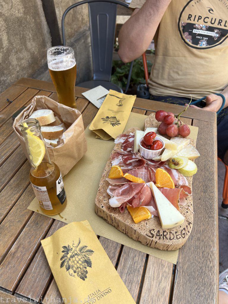 In Bosa selbst liefen die Vorbereitungen für das jährliche Bierfest auf Hochtouren, was am nächsten Tag startete. Wir entschieden uns nach unserem Badeausflug noch einmal durch die Straßen zu schlendern und zur Festung zu laufen. Auf dem Rückweg fanden wir das kleine Restaurant, Locanda di Corte, in dem wir ein lokales italienisches Menü probierten. Als Secondo Piatto gab es Schwertfisch, der sehr lecker schmeckte. Das ganze Menü war köstlich.