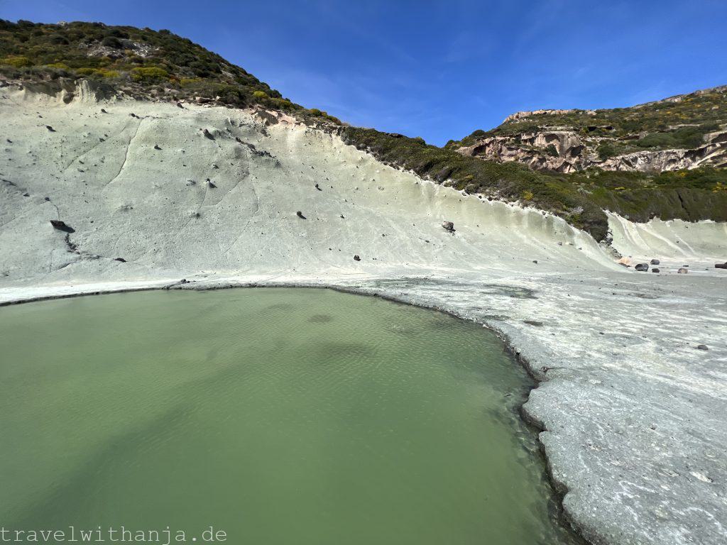 Ein weiteres Highlight in Bosa sind die Wasserlöcher am Meer, rechts von der Temo-Mündung. Wir sind erst über eine Straße in die Richtung gelaufen und am Ende mussten wir einen kleinen Pfad herunter auf das Steinplateau kraxeln. Es erinnert an eine Mondlandschaft. Türkise Wasserlöcher in diverser Größe erstrecken sich über die malerische Gesteinslandschaft am Meer. Einige sprangen von einer hohen Klippe in ein tiefes Wasserloch, andere saßen nur am Rand der Löcher, um ihre Füße zu erfrischen. Ich wagte es ins Wasser zu springen, allerdings erwies sich das herausklettern etwas schwierig, denn die Steine waren mit Korallen überdeckt.