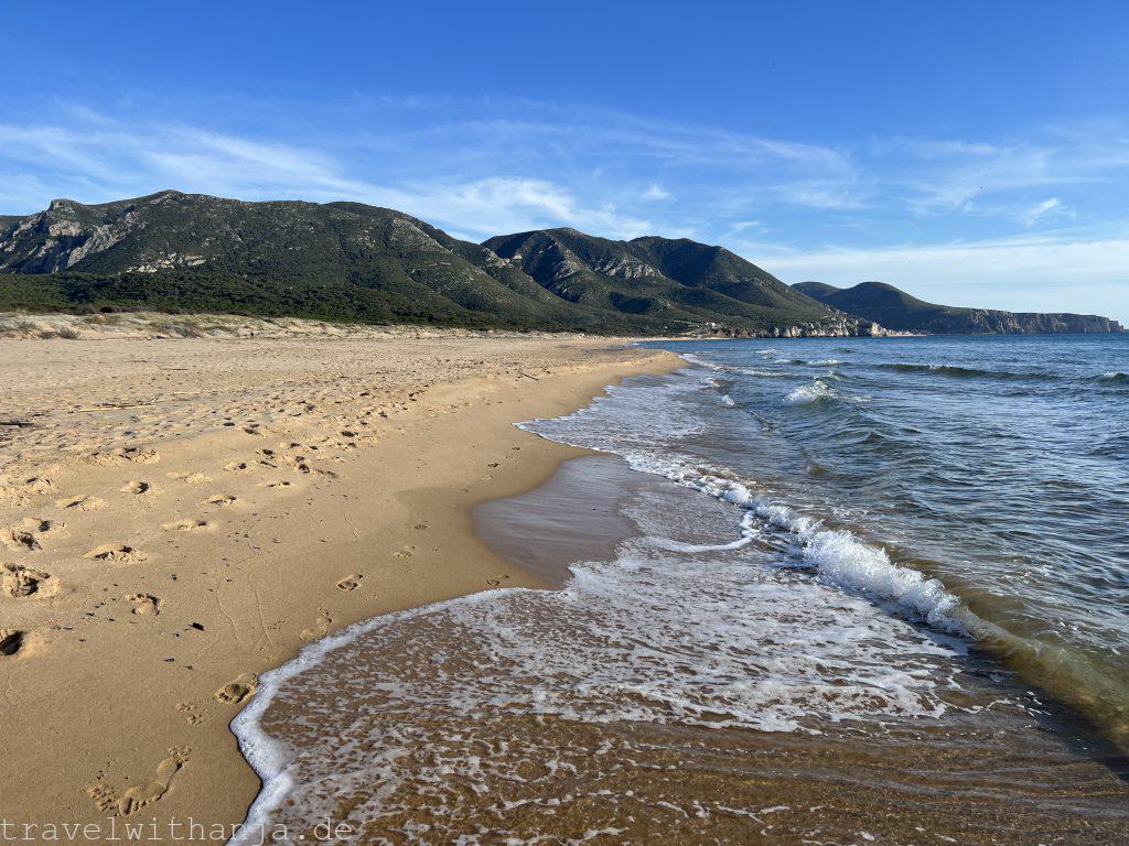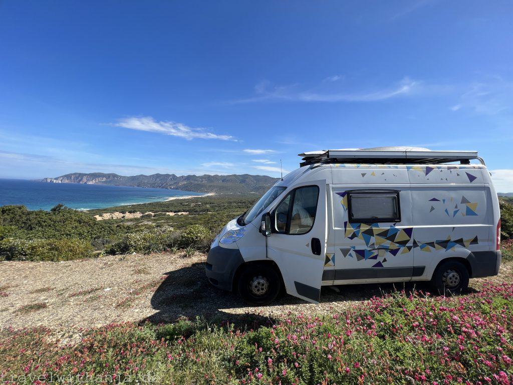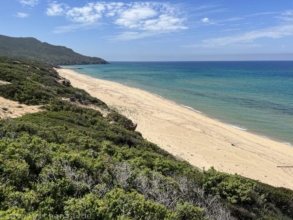 Unser nächstes Ziel war Buggerru, ein bekannter Surfspot. Auf dem Weg dorthin schauten wir uns jedoch noch einen weiteren Strand an bei Arbus. Dieser Küstenabschnitt erinnerte uns fast etwas an Portugal. Ein langer, breiter, weißer Sandstrand und in der Ferne waren Felsen die ins Meer ragten. Spontan entschieden wir uns für einen weiteren Strandtag. Der Parkplatz oberhalb vom Strand war vollgestellt mit Campern und Wohnmobilen. Im Sommer kann man hier offiziell für eine Gebühr übernachten.