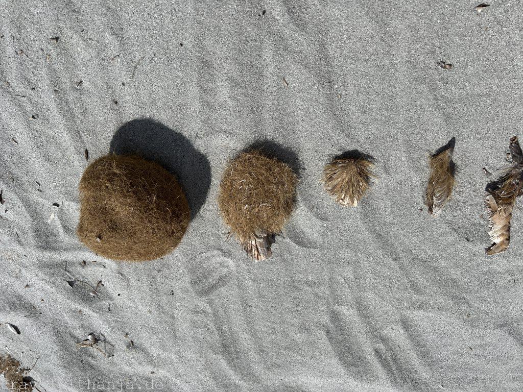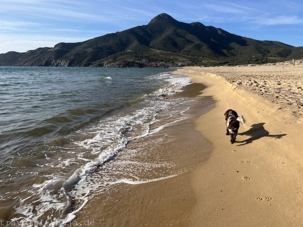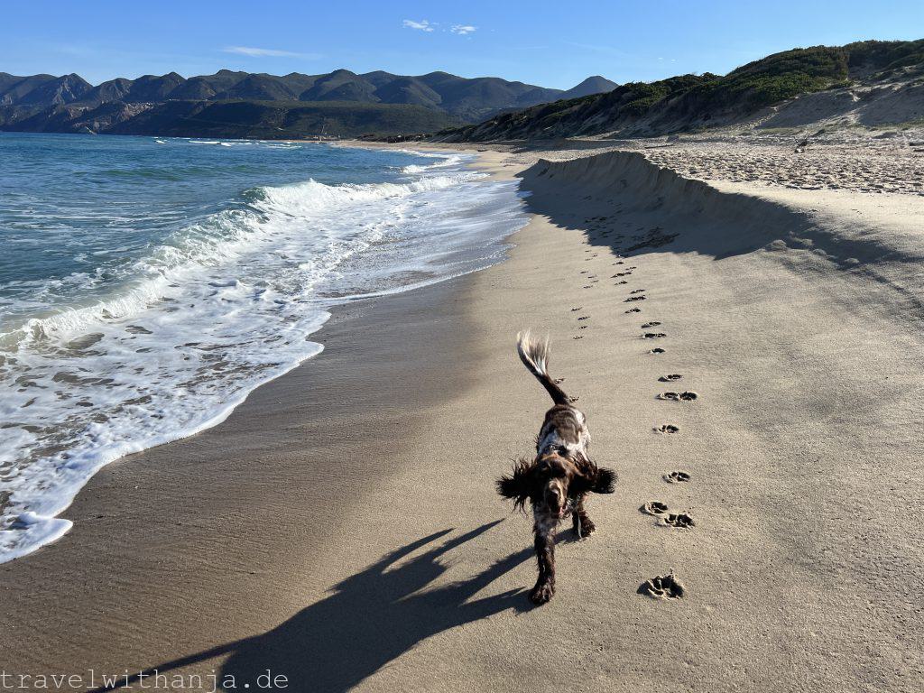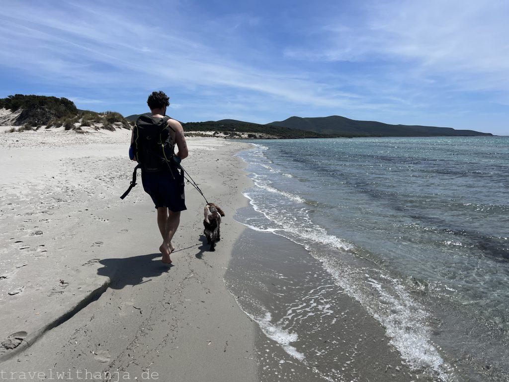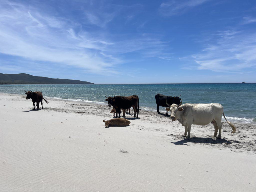 Da am nächsten Morgen jedoch nicht genügend Wind vorhanden war, fuhren wir weiter Richtung Osten nach Porto Pino. Dies ist ebenfalls ein beliebter Kitespot. Wir wollten uns allerdings erst einmal die Dünenlandschaft anschauen und wanderten am Strand entlang. Das Wasser war türkis und glasklar, der Strand schneeweiß. Auf dem Weg zu den Dünen begegneten uns Kühe, die am Ufer rasteten. Am Strand lagen zudem zahlreiche Seegrasbälle, welche Grobi immer sehr gerne mitnahm.