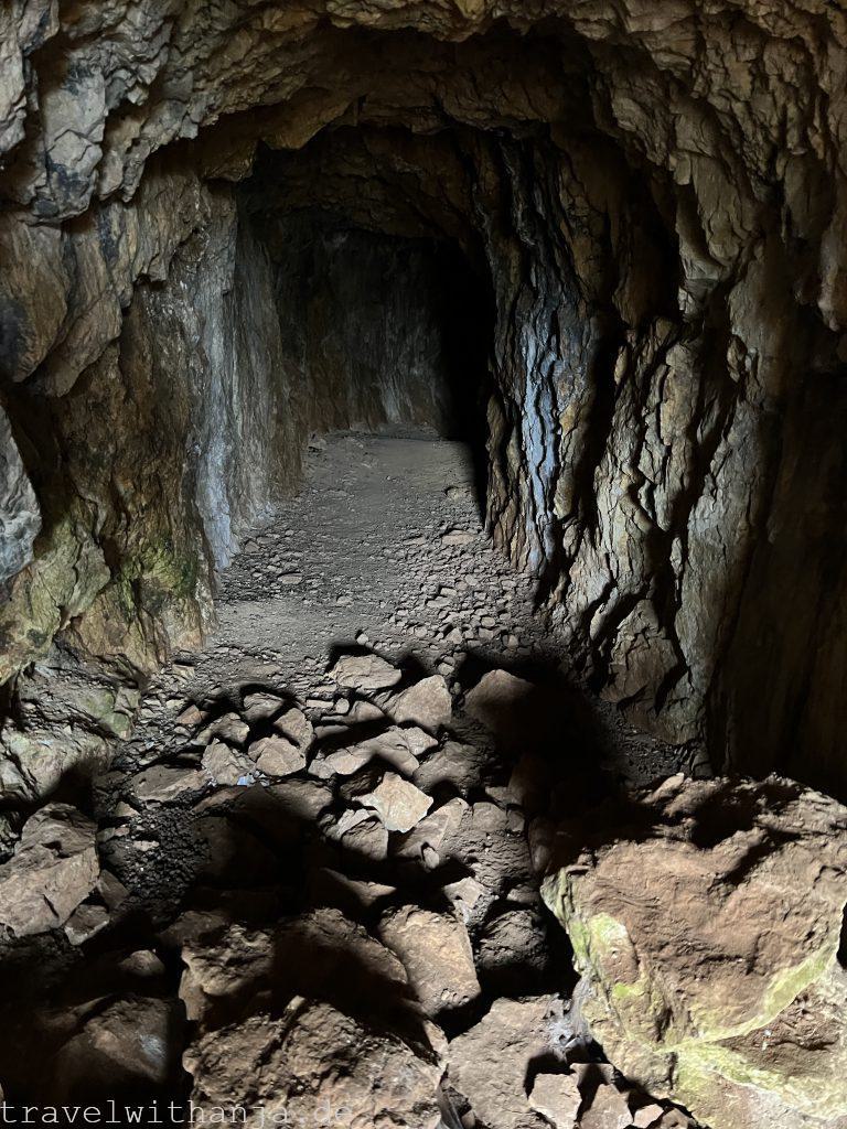 Außerdem entdeckten wir eine offene Höhle, die wohl zum Bergwerk gehörte. Sie führte in den Berg hinein. Vor einer Kurve entdeckten wir große Knochen am Boden, was uns etwas zum schmunzeln brachte und wir uns lieber dafür entschieden wieder umzudrehen. Weiter oben am Berg erreichten wir einen weiter ausgesetzten Wanderweg. Hier standen am Rande oft Schilder, die vor Minen warnten und die Höhlen wurden hier zugeschüttet.