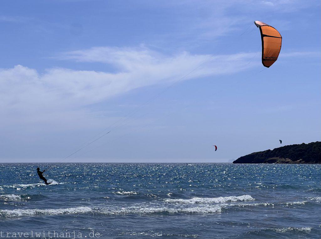 Leider hielt die Wettervorhersage nicht, was sie versprach. Der Wind wurde nur am Nachmittag für 1-2 Stunden stärker und reichte gerade so für mich zum Kiten. Für Sven war der Wind zu schwach. Die Kitesession war für mich allerdings sehr gut und es machte Spaß durch das türkise Wasser zu fahren bei milden Temperaturen. Mein dicker Neoprenanzug erwies sich als zu warm.