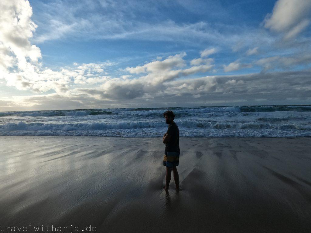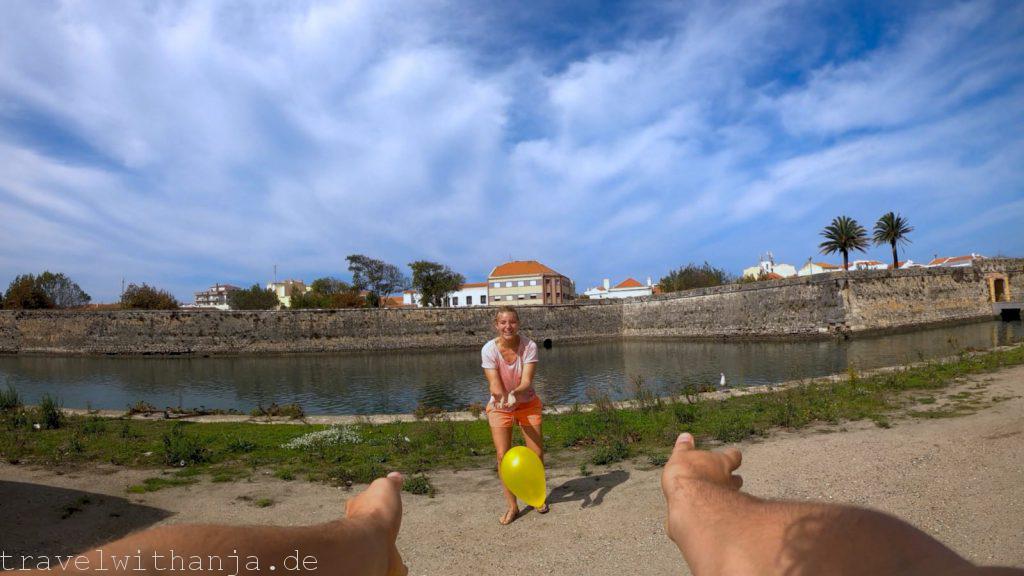 Am Montag hatte Sven Geburtstag. Passend zu seinem Geburtstag ging sein Geburtstagswunsch in Erfüllung und wir gingen am Südstrand von Peniche surfen. Lustigerweise ist das das 3. Jahr in Folge gewesen, das Sven sich Surfen zum Geburtstag gewünscht hat und es ging in Erfüllung – in Portugal. Das muss Schicksal sein. Vorher mussten allerdings noch kurz die Geburtstagswasserbomben ausprobiert werden. Beim zuwerfen platzte die Wasserbombe immer bei mir – das war sicher das Geburtstagsglück für Sven. Abends kochte ich uns noch mit traumhafter Aussicht auf das Meer ein drei Gänge Menü und wir ließen den Tag gemütlich ausklingen. Zum Nachtisch gab es leckeren selbstgemachten Käsekuchen – ja selbst das ist möglich ohne Ofen. Es gibt super leckere Kühlschrankkuchenrezepte, daher gab es einen Himbeer-Heidelbeer Frischkäsekuchen mit Butterkeksboden. Denn Sven liebt Käsekuchen. 🙂