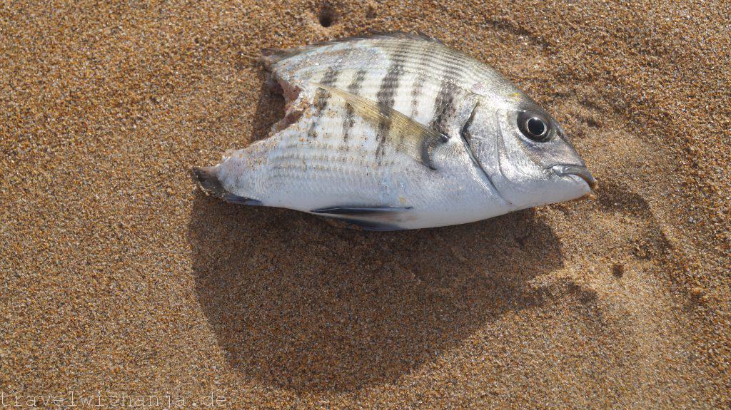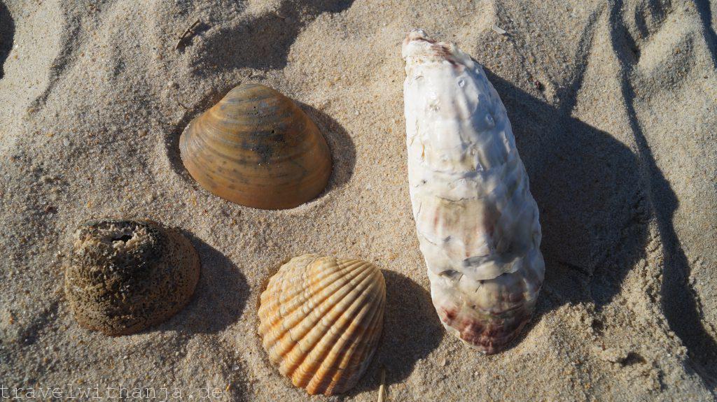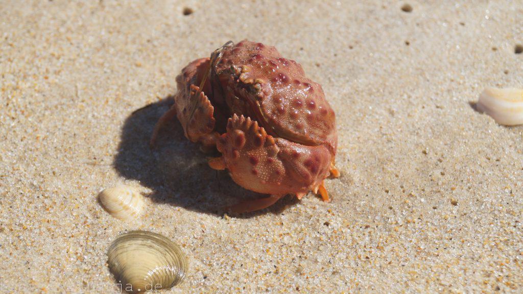 Dort verbrachten wir unseren Donnerstag. Die Sonne strahlte den ganzen Tag und es war herrlich warm. So einen Tag hatten wir schon lange nicht mehr. Auch das Meer war wieder eine herrliche Erfrischung und nicht zu kalt, um kurz schwimmen zu gehen. Außerdem lagen am Strand tausende schöne Muscheln. Wir konnten so richtig die Seele baumeln, uns von der Sonne bräunen und den Wellen erfrischen lassen. Einfach herrlich! Sven rettete zudem einen angespülten feuerroten Krebs und gab ihm wieder die Freiheit im offenen Meer zurück.