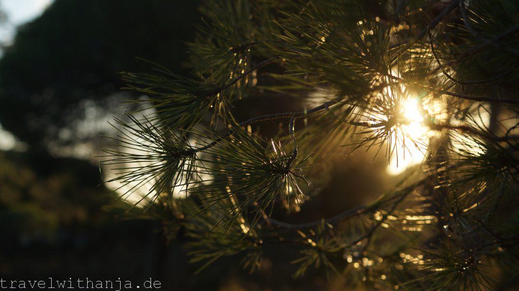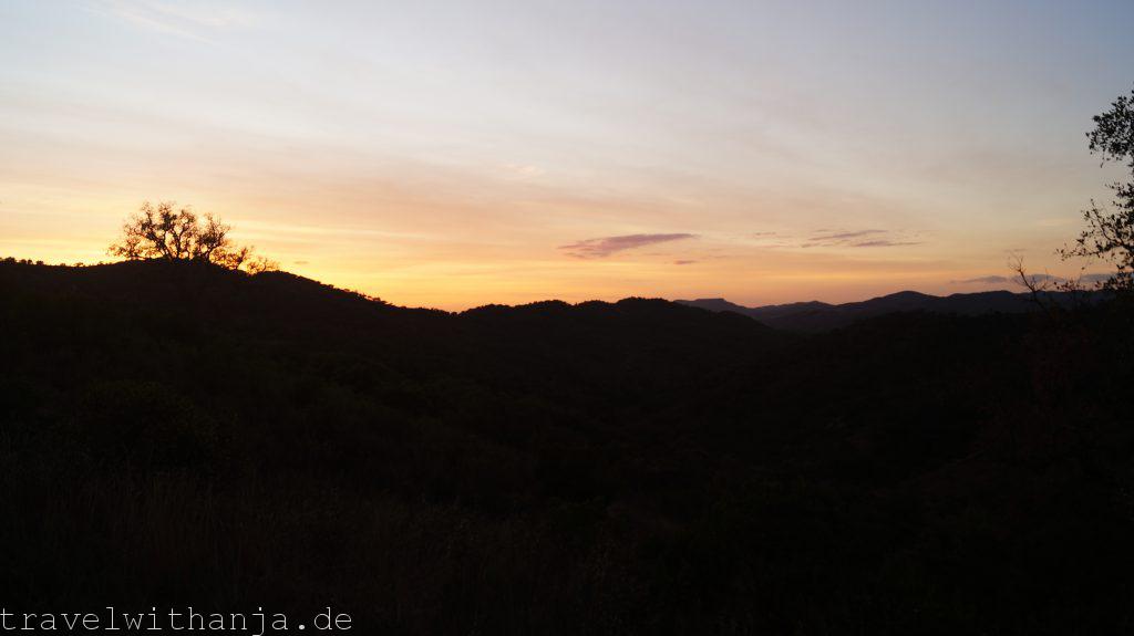 Da unsere Wanderung dorthin zu viel Zeit in Anspruch genommen hatte, sollte dies auch die einzige Route für den Tag gewesen sein, denn es wird nun deutlich früher dunkel. Also wanderten wir diesmal oben am Fels wieder zurück zum Parkplatz. Wir suchten uns einen freien „Baumstellplatz“ auf Park4night ca. 20 Minuten entfernt vom Fels. Der Sonnenuntergang war traumhaft. Wir hatten eine traumhafte Aussicht auf rötlich schimmernde Berge und einen pinken Himmel von dort, wo wir unser Abendbrot genossen – selbstgemachte Sommerrollen.
