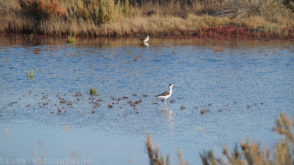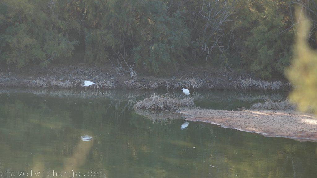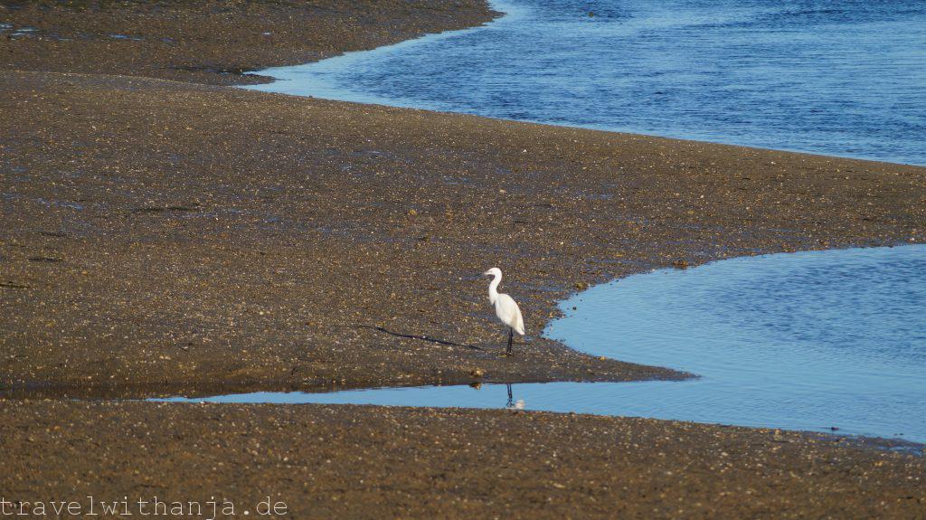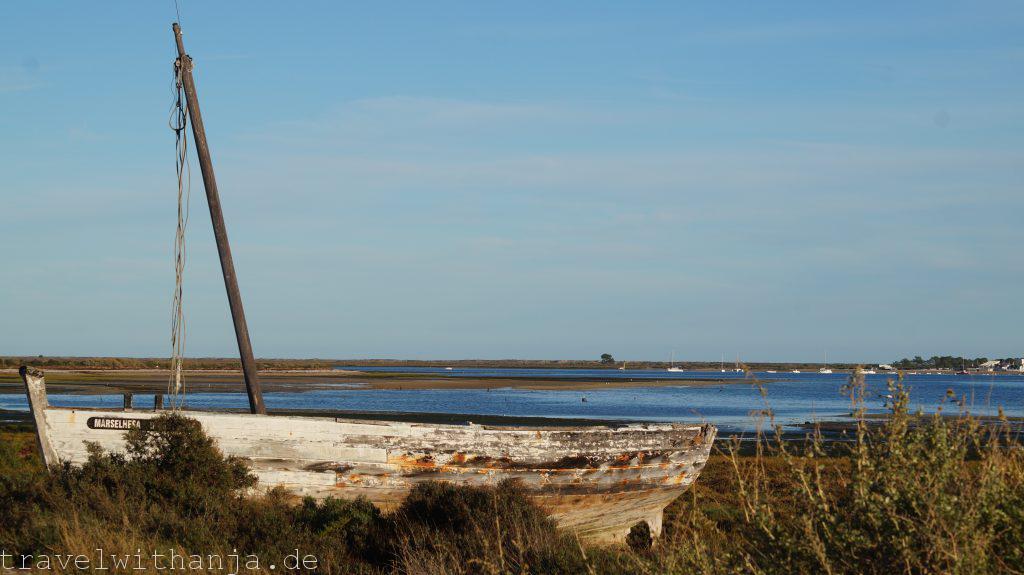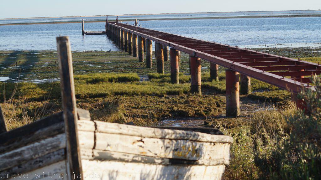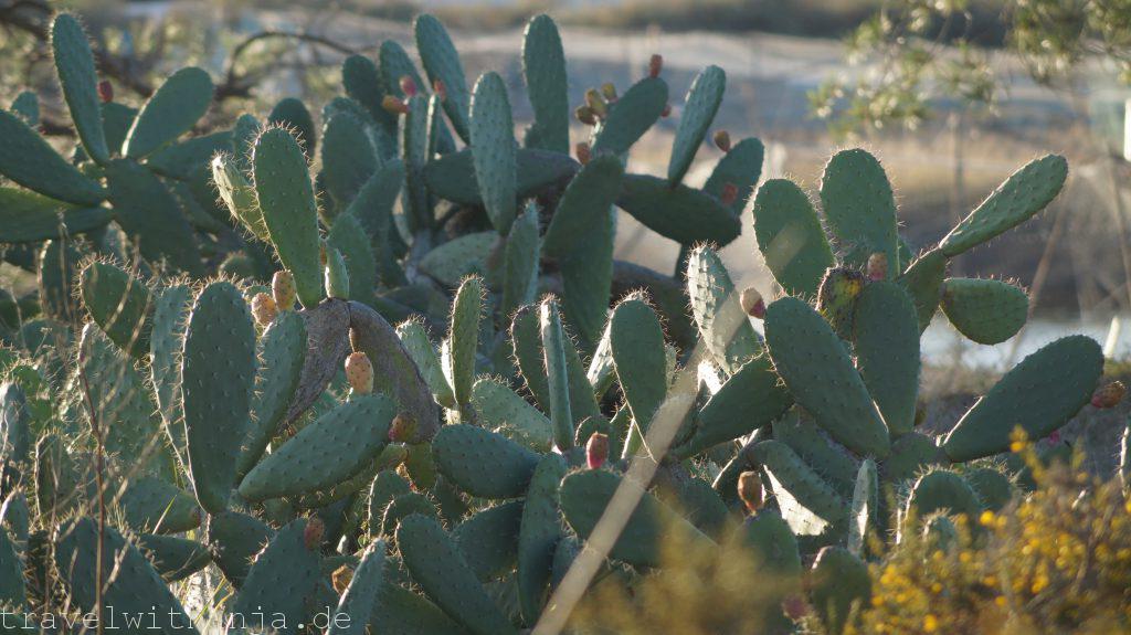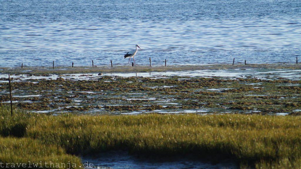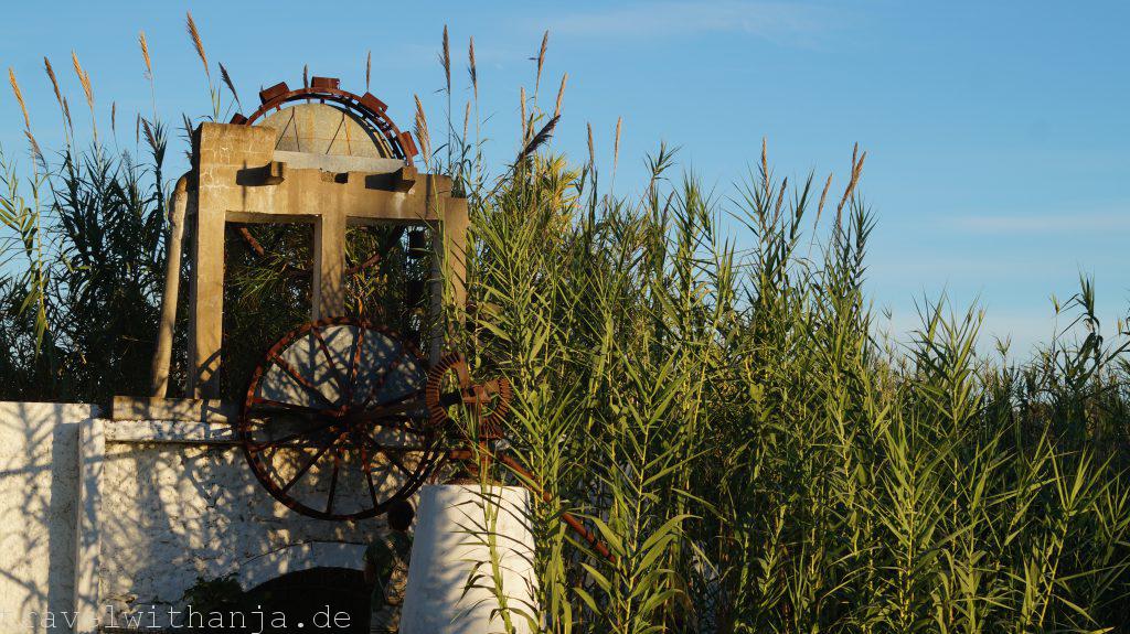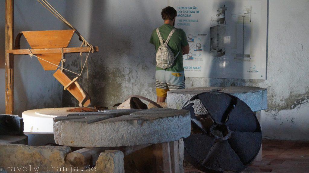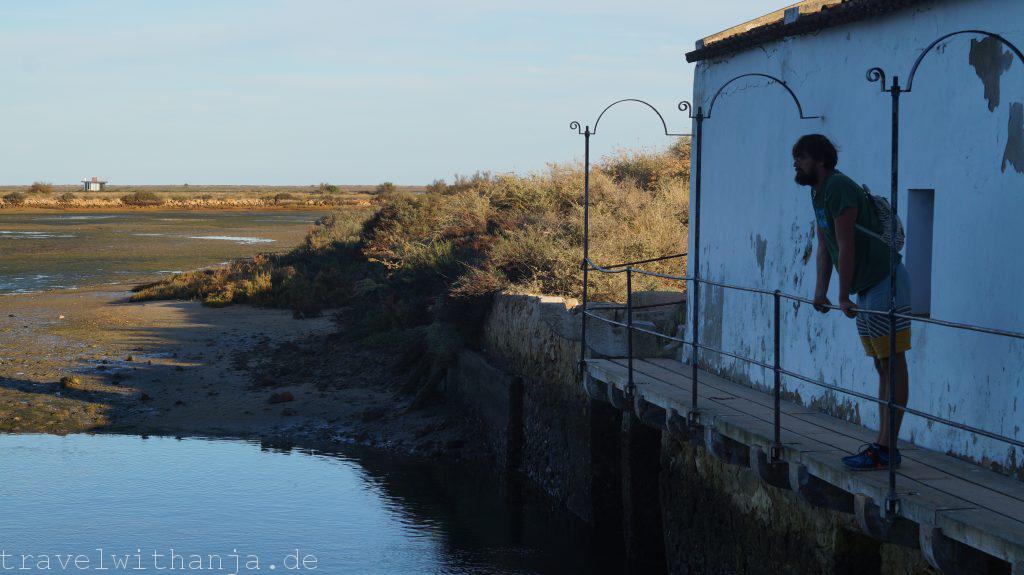 Eigentlich wollten wir am Mittwoch wieder zum Kletterfelsen fahren. Da Sven jedoch Probleme mit seinen Kletterschuhen hatte (super eng) entschieden wir einen Tag Pause zu machen und Richtung Meer zu fahren. Bei Faro gab es einen Strand, an dem man angeblich auch manchmal surfen kann, Praia de Faro. Wir schauten uns diesen an, jedoch gab es keine Wellen. Also legten wir uns erstmal an den Strand tranken ein kühles Radler und genossen die Sonne. Irgendwie konnte das jedoch noch nicht alles gewesen sein. Der Unternehmungsdrang steckte in uns und so fuhren wir zum Naturpark Ria Formosa, wo zu dieser Jahreszeit zahlreiche Vögel landen oder sogar überwintern, unter anderem Flamingos. Der Nationalpark nahm für einen 3 km langen Rundweg 2,80€ Eintritt. Wir dachten uns, für die Flamingos ist es uns das wert. So liefen wir durch den kleinen Park und suchten vergeblich die rosa Vögel. Dafür sahen wir einen Graureiher, Enten und andere Vögel. Interessanter war die Gezeitenmühle und die alte Wassermühle die früher von einem Esel angetrieben wurde, um Wasser aus der Tiefe für Obstbäume, wie z.B. Pflaumen und Zitronen, heraufzuholen.