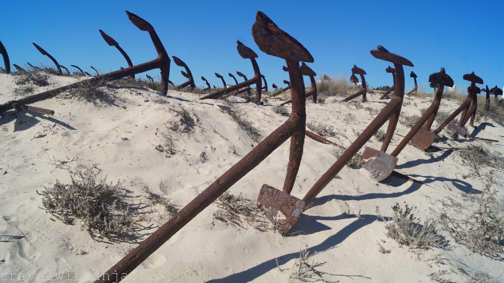 Zum Frühstückt pflückte ich uns ein paar frische Clementinen. Sie schmeckten wunderbar aromatisch und nach Sonne pur. Anschließend fuhren wir zum Ankerfriedhof. 248 Anker liegen am Praia do Barril.