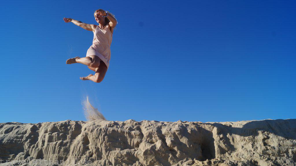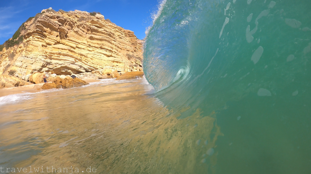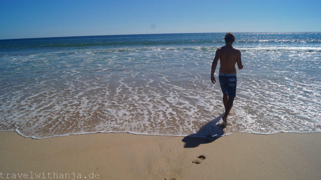 Am Samstag wollten wir noch einmal in den Genuss des Lineups kommen und gingen zu unserem Hausstrand. Leider waren die Wellen viel niedriger als angekündigt. Dafür schien die Sonne wieder den ganzen Tag und es war wunderbar warm. Wir gingen im Meer baden, sprangen durch die Wellen, machten ein paar coole Wellenfotos und zur Krönung schwammen in der Ferne noch ein paar fröhlich herumspringende Delphine vorbei. Sie boten uns eine kleine Show, versprühten Freude und Dankbarkeit für diesen wunderbaren Tag. Zum Sonnenuntergang gingen wir wieder zum Camper.