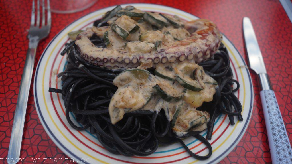 Zum Abschluss des Tages kochten wir uns schwarze Sepia Spaghetti mit Oktopus und Zucchini. Ich hatte noch nie zuvor Oktopus selbst gekocht. Es schmeckte tatsächlich sehr gut. Auch die schwarzen Nudeln sind für besondere Anlässe eine schöne Abwechslung, schmecken allerdings fast wie normale Spaghetti.