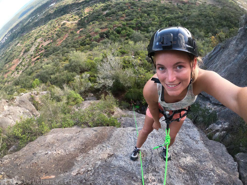 Anschließend ging es aber wirklich zum Sektor 13. Da unserer Route gerade besetzt war, machten wir eine kleine Mittagspause in der Sonne. Es war wunderbar warm. Wir lernten ein Pärchen aus der Schweiz kennen, die auch zum gleichen Sektor wollten, die ein Kletterbuch von Portugal besaßen. Sie empfohlen uns die Route 8 im Sektor 9, welche auf unserer Topo nicht abgebildet war. Gemeinsam gingen wir aber erstmal zur 13. Diesmal kletterte ich die Route Flintstones, eine 4+, im Vorstieg und stieg sie durch. Seit langem war das meine erste Outdoorroute im Vorstieg. Eine schöne Platte mit kleinen aber feinen Griffen. Oben angekommen genoss ich den Erfolg, das Vertrauen in mir selbst – denn ich habe immer noch ein wenig Höhenangst – und seilte mich mit meiner Acht anschließend wieder ab und sammelte dabei alle Exen wieder ein.