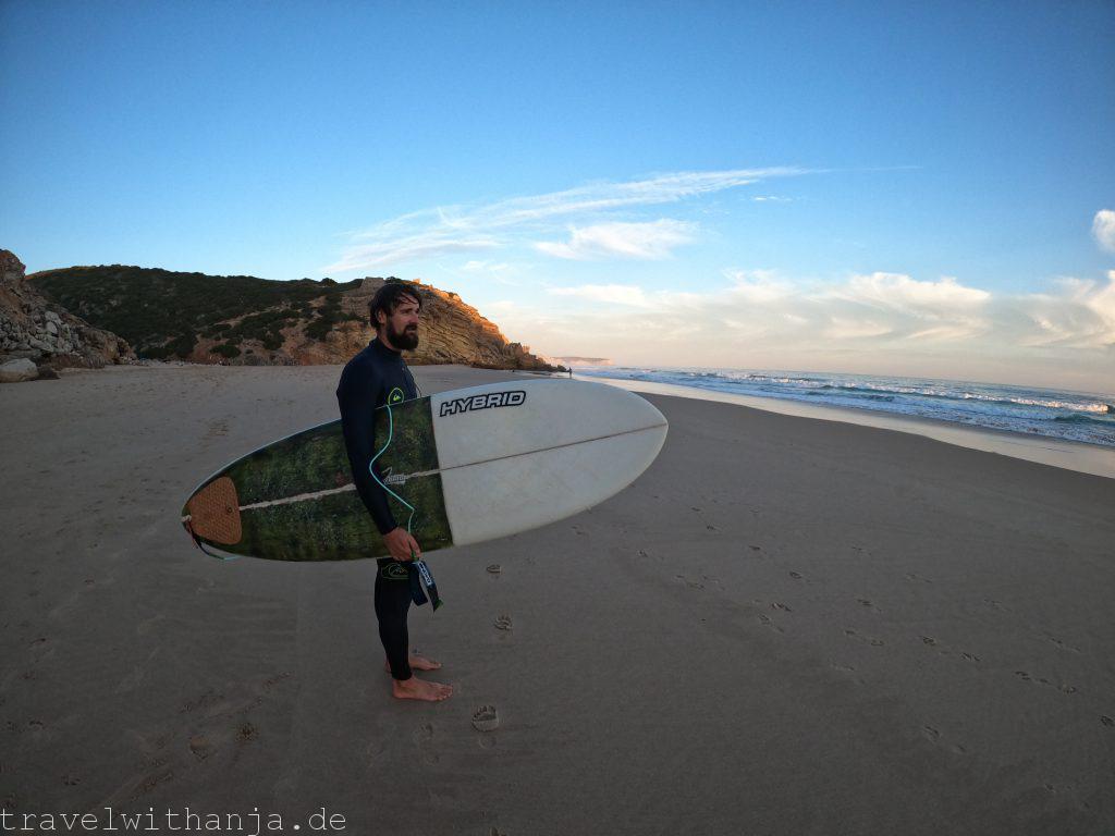 Am Freitag strahlte die Sonne wieder aus allen Löchern und wir liefen mit unseren Surfbrettern 20 min zu einer kleinen recht einsamen Sandbucht, Praia da Figueira. Wir sonnten uns bis nachmittags die Wellen größer wurden, als Ebbe kam. Die Wellen brachen traumhaft, sodass wir das Lineup genießen konnten. Abends saßen wir gemütlich draußen am Camper und aßen Abendbrot.